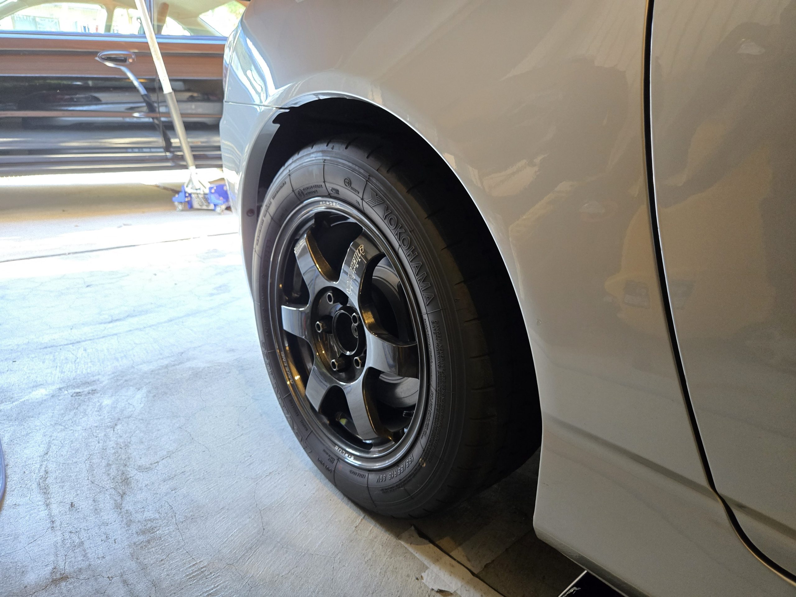 まず、リア。15インチ 7J/+35のオフセットですが、問題なく装着完了