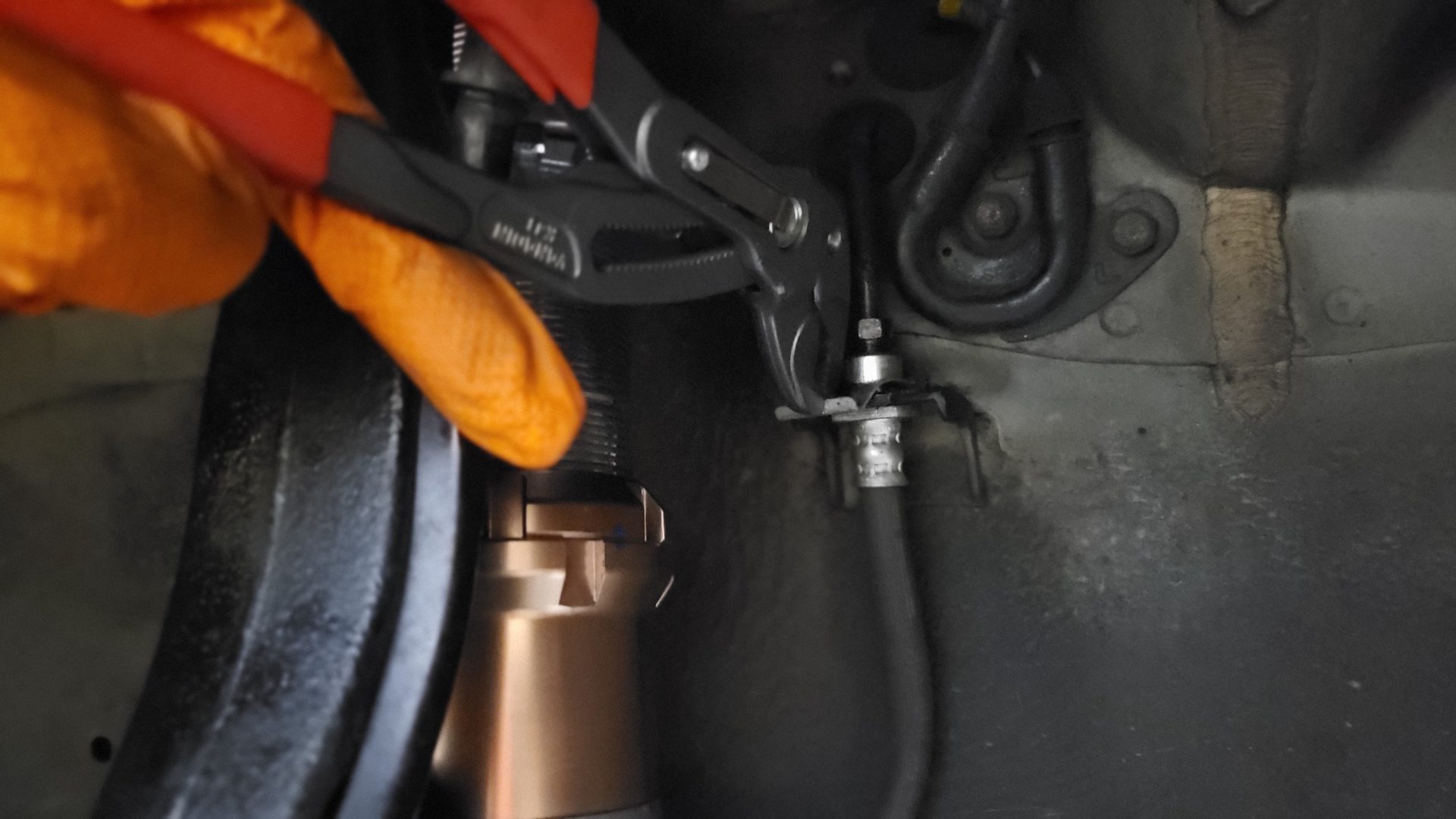 Pull out pin fixing brake hose with pliers.